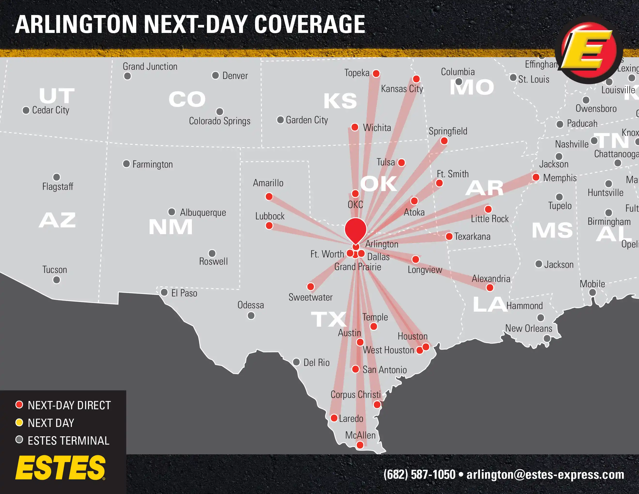 Need reliable LTL freight shipping? Estes offers next-day direct LTL from Arlington and Fort Worth to Dallas, Houston, San Antonio, Austin, Oklahoma City, Kansas City, Memphis, Tulsa, Wichita, Little Rock, McAllen, Corpus Christi, Topeka, Laredo, and Amarillo.