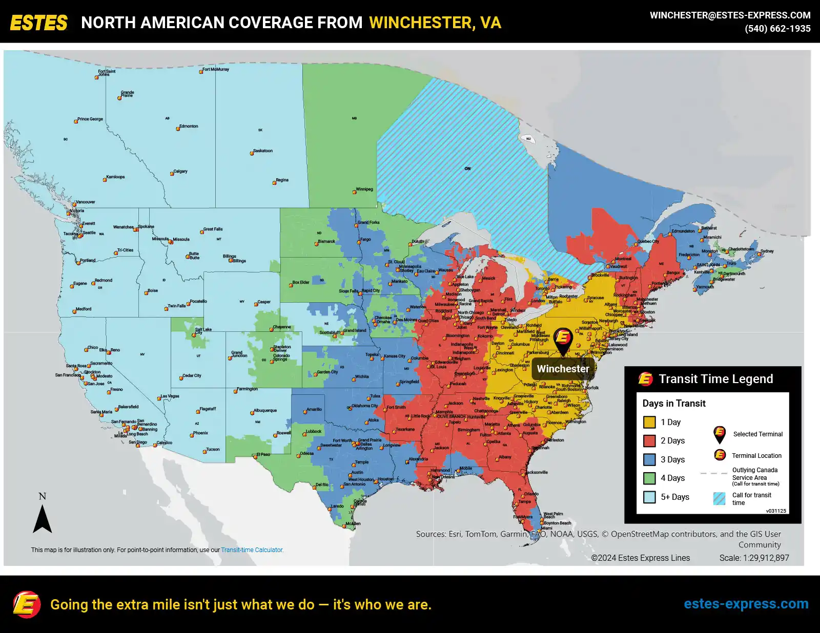Estes offers next-day LTL freight shipping from the Reston-Leesburg-Winchester area to Philadelphia, Charlotte, Toronto, Cincinnati, Cleveland, Baltimore, Pittsburgh, Buffalo, Columbus, Raleigh, Richmond, Norfolk—and more.